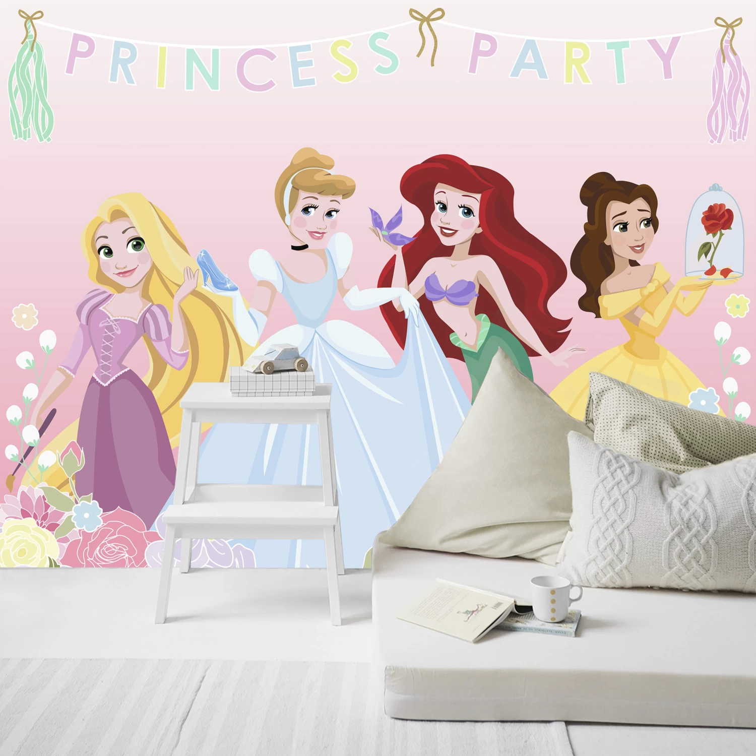 | Dessin | Assepoester, Belle, Ariel en Aurora omgeven door bloemen en slingers |